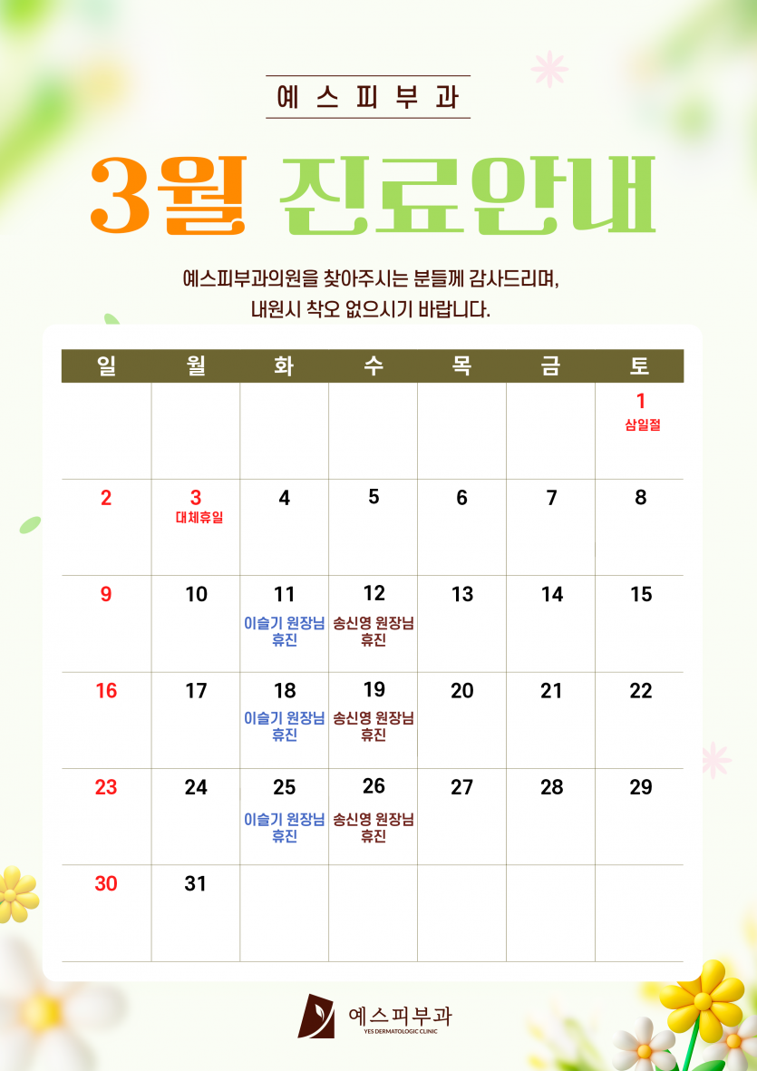 영종도 예스피부과 3월 진료안내 페이지 정보 최고관리자 0 Comments 832 Views 25-02-17 10:04 본문 안녕하세요! 예스피부과입니다.본원의 각 원장별 3월 진료일정 안내드립니다.진료 및 휴진 일정 참고하시어내원 시 착오 없으시길 바랍니다^^진료문의032-752-9730 이전글영종도 예스피부과 4월 진료안내 25.03.17 다음글영종도 예스피부과 2월 진료안내 25.01.17 Comments 댓글목록 등록된 댓글이 없습니다.